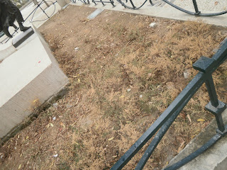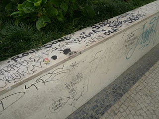 Todo o Jardim das estátuas está bem longe do jardim formal que inicialmente se pretendia e nada mais é que um lugar de desmazelo e sem charme algum. No patamar superior, a degradação continua...desta vez, são as centenas de tags que cobrem os muros junto ao canteiro das Hortências, elas próprias em muito mau estado também. As Ericáceas plantadas no canteiro em volta da estátua de Prado Coelho secaram totalmente e resta um monte de palha. E os Agapantos também já conheceram melhores dias, aos poucos estão a desaparecer, pois toda a gente insiste em fazer dos canteiros local de passagem para evitar andar um metro que seja.