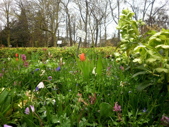 Existe inclusive uma zona de prado, onde podemos ver tulipas, narcisos, varias espécies de anemonas e heleborus em flor. Entre as varias árvores presentes está um magnifico exemplar da nossa azinheira (Quercus ilex) como testemunha a foto seguinte.